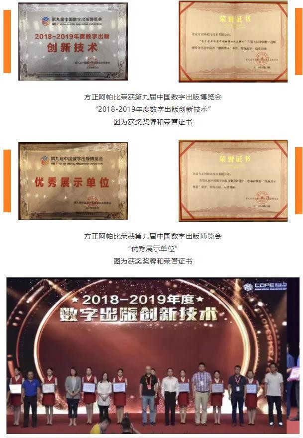 8 月 23 日,在本屆數(shù)博會的頒獎典禮上,方正阿帕比憑借著在數(shù)字出版領(lǐng)域的重要貢獻(xiàn)以及在展會中亮眼的表現(xiàn),榮獲“2018-2019 年度數(shù)字出版創(chuàng)新技術(shù)”以及“優(yōu)秀展示單位”兩項大獎。